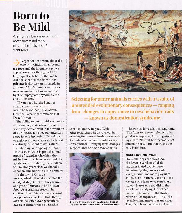 FIRST came the dog, followed by sheep and goats. Then the floodgates opened: pigs, cows, cats, horses and a menagerie of birds and other beasts made the leap. Over the past 30,000 years or so, humans have domesticated all manner of species for food, hunting, transport, materials, to control pests and to keep as pets. But some say that before we domesticated any of them, we first had to domesticate ourselves.