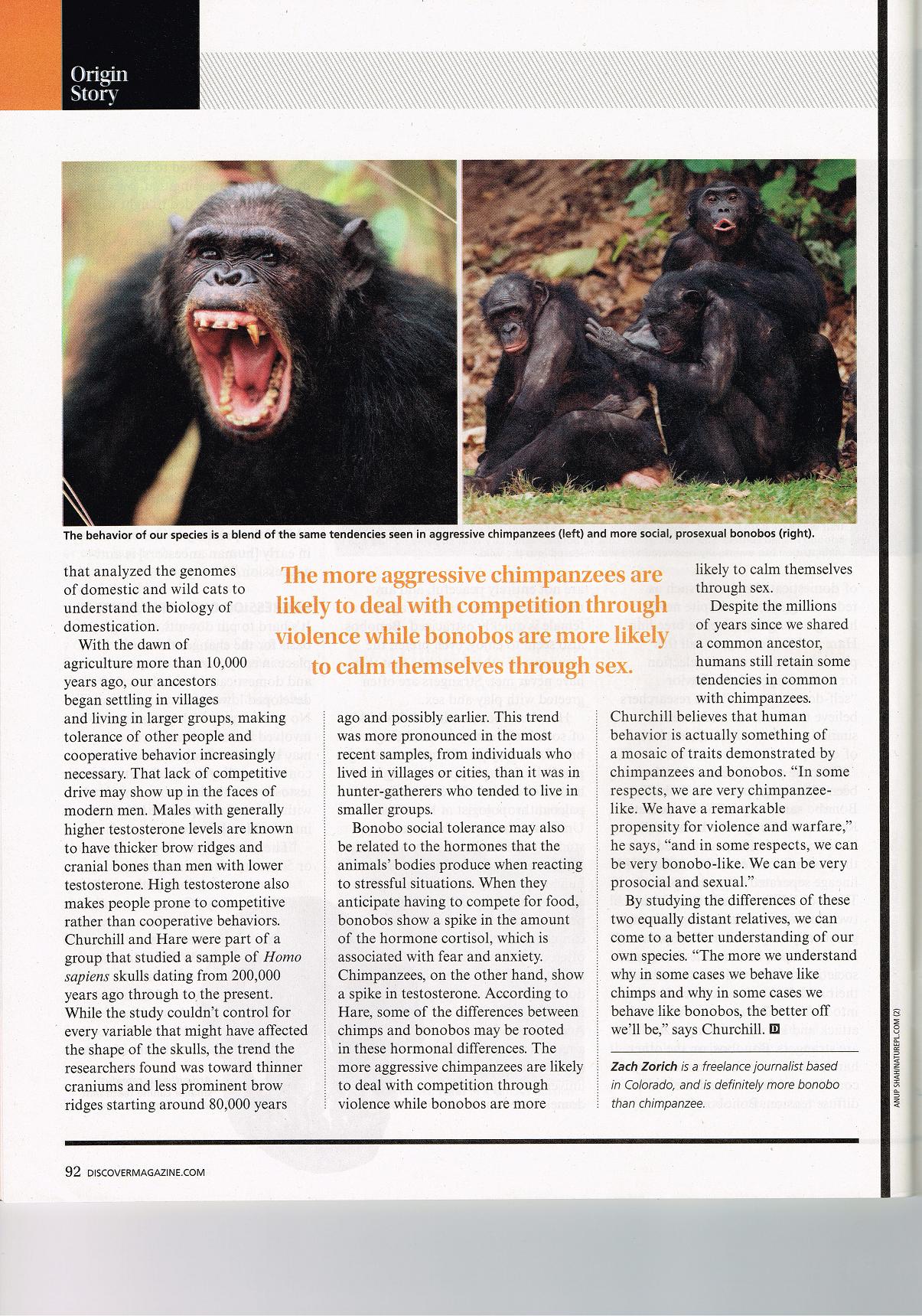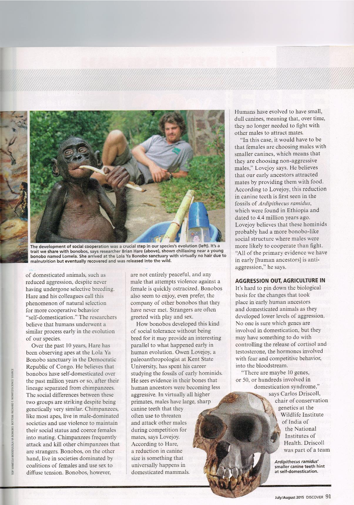 It is possible that being less aggressive and more cooperative was also an advantage for early humans, giving those with these traits a better chance of surviving and reproducing. Alternatively, researchers have argued that humans became less aggressive and more cooperative simply as a consequence of their large bodies and brains. Animals with these features typically show more self-control, so it is conceivable that our ancestors became less impulsive or quick to anger simply by virtue of their size. Sexual selection could also have played a role, with females finding less aggressive males more attractive, perhaps because they provided better care for their young. Wrangham and Brian Hare at Duke University in North Carolina have suggested that a similar process could explain why bonobos have evolved to be so much less violent than chimpanzees.