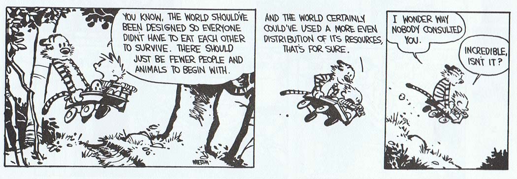 • Why does Nature have to be so cruel? Just about everything alive is either pursued by, or devouring, another creature. Even a child could design a kinder way for creatures to exist.